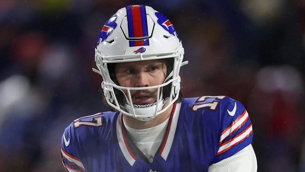 El mariscal de campo de Buffalo Bills, Josh Allen, recibió el balón en un chasquido durante el tercer cuarto del juego de la ronda divisional de los playoffs contra los Baltimore Ravens. 19 de enero de 2025.